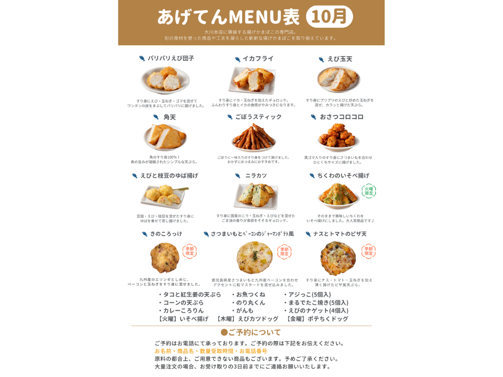 大川本店に隣接する揚げ蒲鉾の専門店。旬の食材を使った商品や工夫を凝らした斬新な揚げ蒲鉾を取り揃えています。